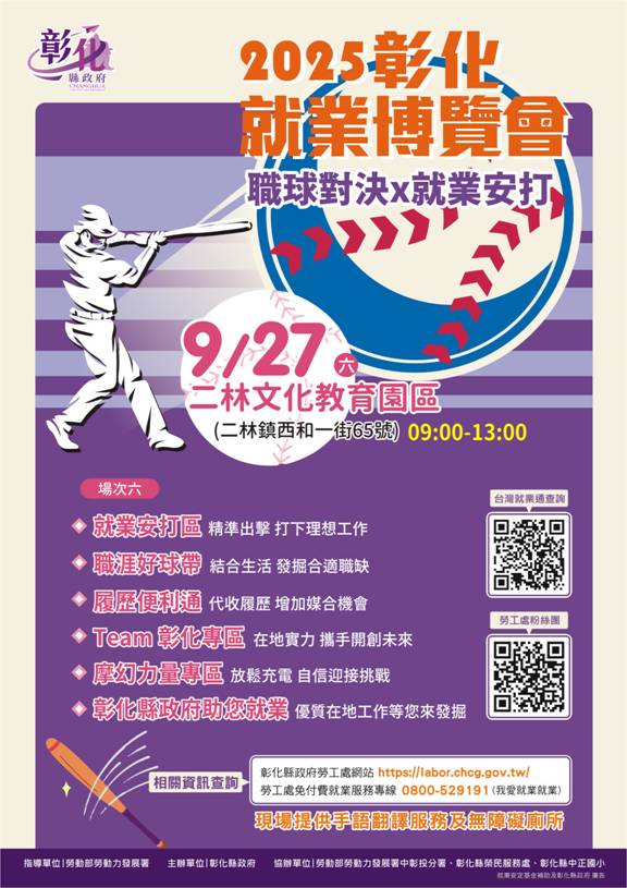 現場有許多客製化且貼心的服務,設有「就業安打區」精準分類職缺,快速媒合找尋特定職缺的需求。為貼近職場即生活,特設「職涯好球帶」,邀請涵蓋食、衣、住、行等產業特色廠商提升民眾對在地產業認知度,讓求職者在熟悉的環境中發掘合適的工作。本場活動亦設置「履歷便利通」諮詢專區,提供未能設攤廠商代收履歷服務,現場代收履歷、後續協助聯繫與追蹤,創造就業的最大可能性,提高民眾求職媒合率。此外「摩幻力量專區」透過視障按摩體驗,釋放壓力,提振精神,增加求職戰鬥力。同時也提供手語翻譯、職災、求職防騙與身障就業諮詢等多元貼心服務,陪伴您安心走在就業的每一步。歡迎待業者、轉職者、兼職者的上班族於9月27日帶上履歷表,開創屬於你的「薪」未來,迎接更好的「薪」生活!