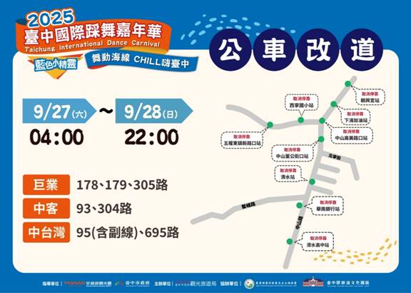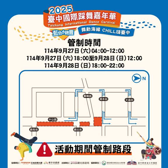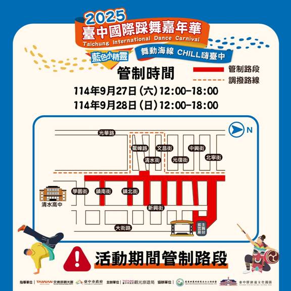 2025台中國際踩舞嘉年華將於9月27日至28日在清水盛大舉行,市府將自9月24日起於紫雲巖前搭設晚會舞台、9月27日清晨4時起於中山路與鰲峰路口搭設觀禮台並進行交通管制,至9月28日晚間10時恢復通行,將影響中山路及北寧街車輛行駛與路邊停車,已於活動道路周邊設置改道及交通管制牌面提醒用路人。
