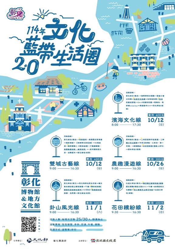 為串聯彰化縣內各區域文化館舍,推廣博物館與地方文化館周圍的文化資源,文化局將於10/12(日)、10/26(日)、11/1(六)、11/2(日)辦理4天共5場次的文化藍帶生活圈2.0走讀活動,並於即日起開放線上報名,邀請您體驗彰化人文及文化館所的獨特之美。