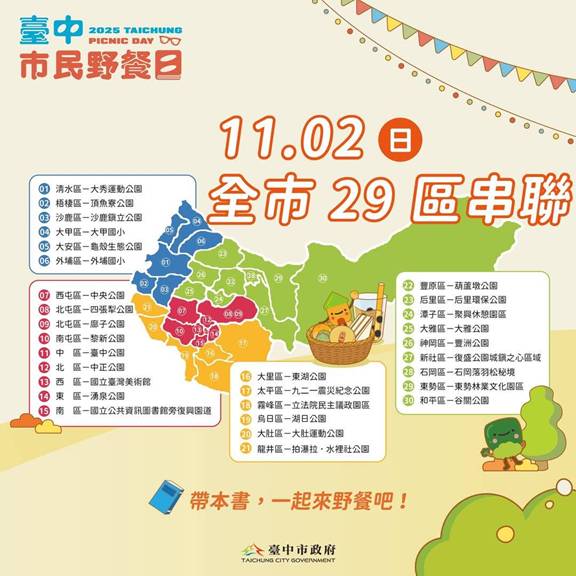 台中市第四屆「市民野餐日」即將在11月2日盛大登場!今年活動跳脫以往形式,特別結合台中綠美圖開幕盛會,以「閱讀×野餐」為雙主軸,首度推出「帶一本書來野餐」的全新概念,台中市長盧秀燕表示,歡迎屆時攜家帶眷、帶著喜歡的書,一同在秋日暖陽下享受閱讀與野餐的悠閒時光。