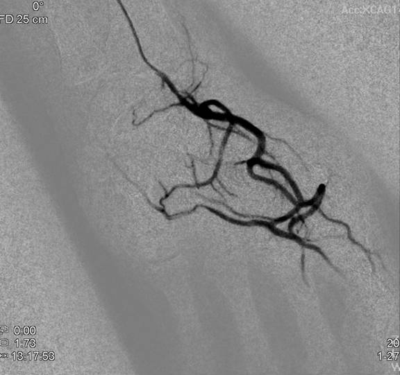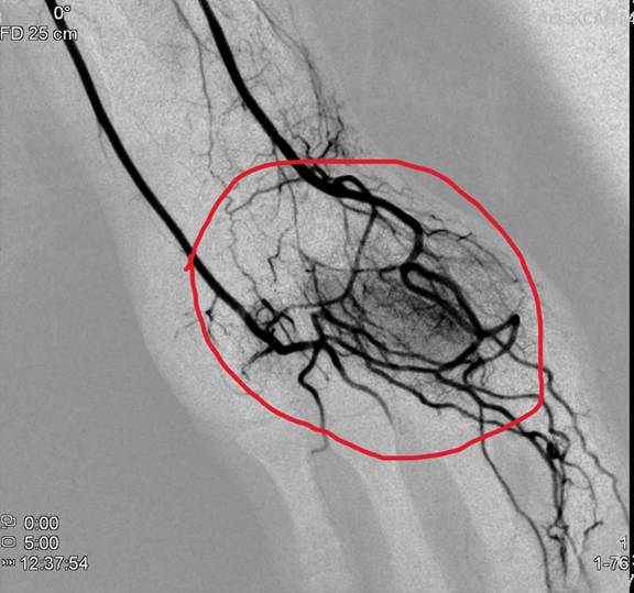 圖說:一名廚師患者因長期用手拿很重的鍋具,造成職業傷害,手部劇烈疼痛無法工作,從影像可以看出手腕及手掌有新生的異常「雲霧狀」血管密佈(圖中紅圈處)。