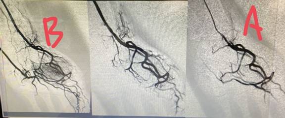 員榮心導室主任林彤宥醫師表示,臨床經驗顯示,這項療法過程與心導管、腫瘤栓塞治療類似,醫師會從手腕橈動脈或鼠蹊部股動脈進行穿刺,在X光透視下導引微導管,將栓塞劑或微球材料注入異常血管,使周邊異常神經因血流受阻而降低活性,減少疼痛訊號傳導。栓塞後,影像顯示原本「雲霧狀」的血管明顯減少,患者疼痛也隨之改善。