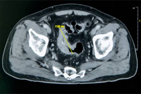 圖1:老翁罹患乙狀結腸癌,腫瘤約7公分造成腸子幾乎完全阻塞。