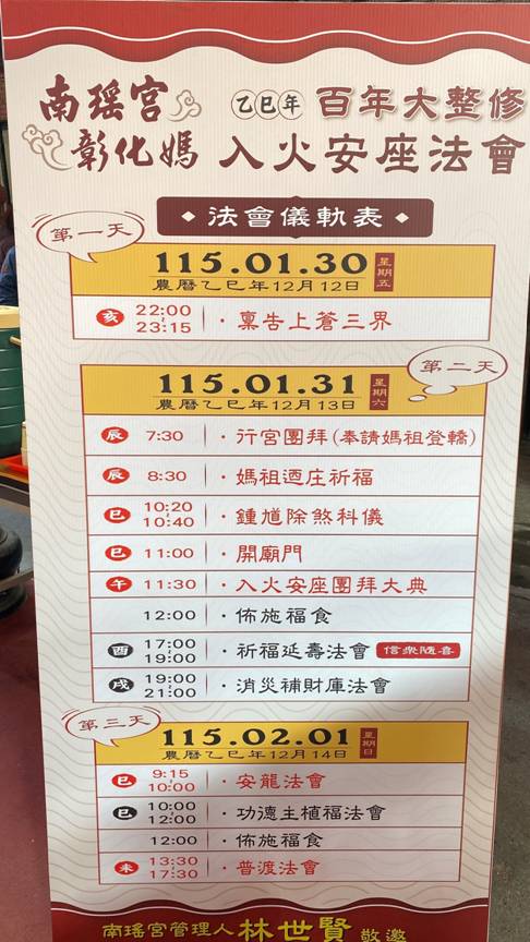 林市長表示,南瑤宮重修入火安座慶典訂於1月30日正式展開,主要儀程包括1月30日敬稟三界上蒼眾神,1月31日舉行媽祖移駕遶境、入火安座及祈福法會;2月1日則進行安龍、植福及布施普渡等儀式。其中,媽祖移駕儀式特別恭請彰邑彰山宮開基池府千歲作伴隨行,源於百年來地方廣為流傳的兩宮姊弟情誼典故,別具歷史意義。