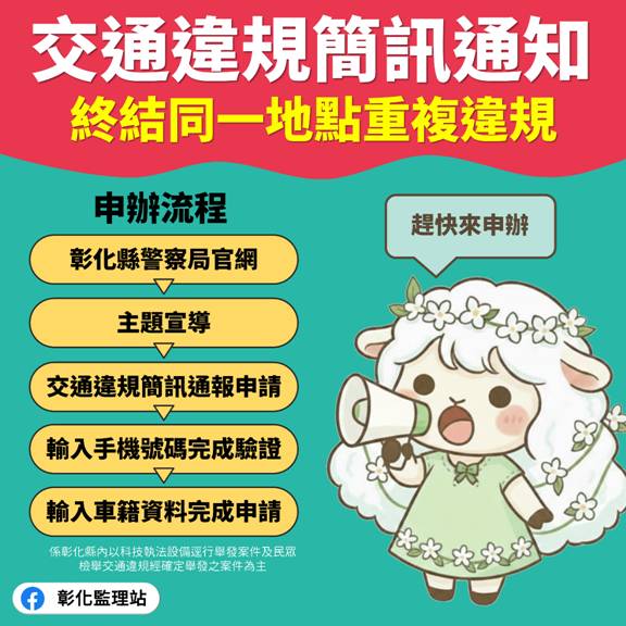 方式完成申請。申請成功後,凡於彰化縣境內因民眾檢舉或科技執法設備取締,且經審核成案之交通違規案件,系統將主動發送簡訊通知,讓駕駛人第一時間掌握違規狀況。