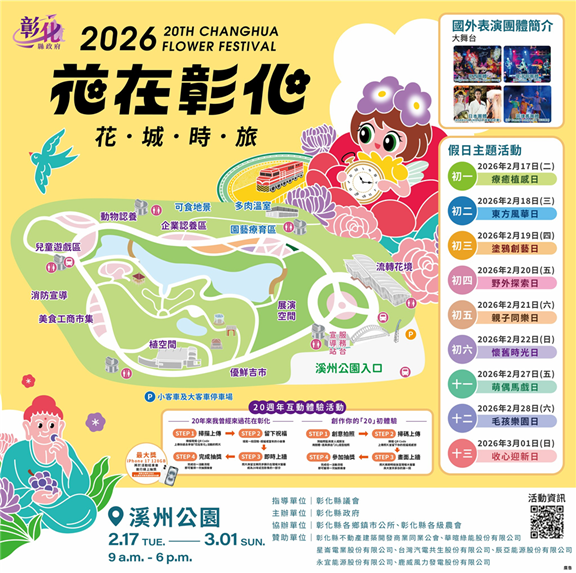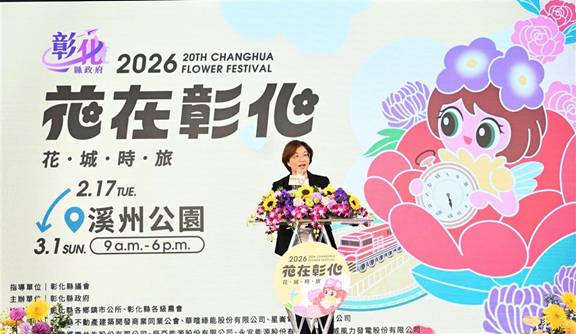 2026「花在彰化」以「花城時旅」為主題,從大年初一(2月17日)至正月十三(3月1日)在溪州公園盛大登場。王縣長表示,今年花在彰化有三大亮點,一是繽紛的花卉饗宴,以「花城時旅」為活動主題,融合生活花藝、永續概念與沉浸式體驗;二是精彩的9大假日主題活動,從親子同樂到毛孩樂園、國際團隊演出及特色市集,推出「滿額送」及「兩倍券」促銷;三是「20週年主題互動體驗」,上傳精彩回憶,即時呈現電視牆、列印紀念照,還可抽