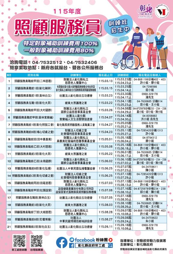 配合中央推動長照3.0,持續擴充照顧服務資源,並因應人口高齡化趨勢與照顧服務人力需求攀升,彰化縣政府今(115)年度持續補助辦理照顧服務員訓練課程,協助失(待)業或在職勞工進入長照產業,期能補足本縣長期照顧人力所需,目前各班次陸續開放報名,歡迎民眾踴躍報名參加。