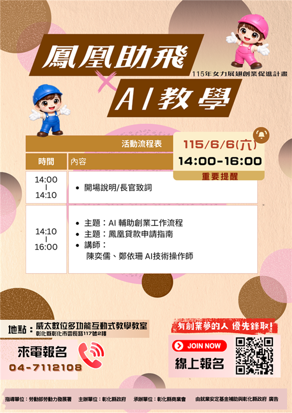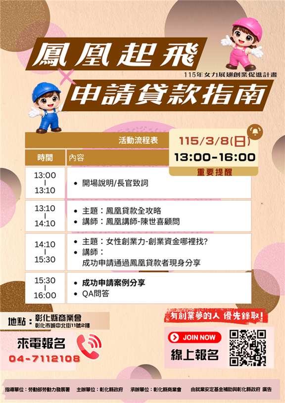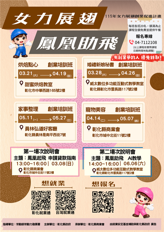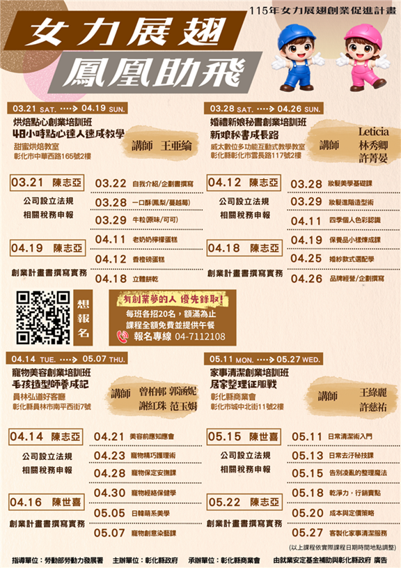 彰化縣政府為了鼓勵更多女性投入創業的行列,今(115)年3月到5月辦理「女力展翅創業課程」,提供有創業意願之女性實現創業夢想,即日起開始招生,全程免費,歡迎設籍彰化縣有創業想法、預備創業或已創業的女性報名參加。