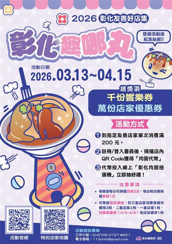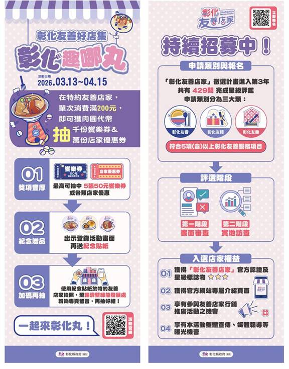 彰化縣政府自113年推動「彰化友善店家」計畫並導入星級認證機制,目前全縣已累積429間通過認證的友善店家,其中134間榮獲最高等級三星認證。即日起至4月15日,民眾於活動期間至指定店家單筆消費滿200元,可依店家星級最高獲得3枚扭蛋代幣,有機會抽中250元饗樂券。4月3日至6日清明連假至店家消費,還可額外獲得一次抽獎機會,邀請全國民眾春日走訪彰化、體驗在地魅力。
