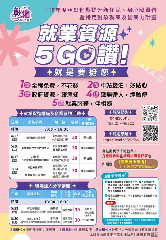 彰化縣政府為協助新住民、身心障礙者及特定對象提升職能並順利就業,今(115)年持續推動「彰化縣提升新住民、身心障礙者暨特定對象就業及創業力計畫」,從求職準備、企業參訪到職場達人分享,提供貼心實用的就業協助。活動已開始招生,歡迎有就業意願的新住民及身心障礙朋友踴躍報名。