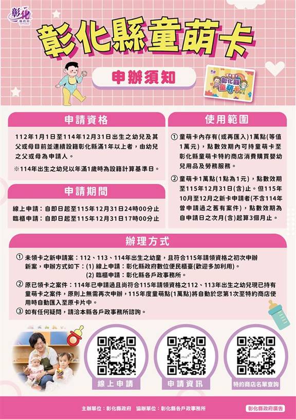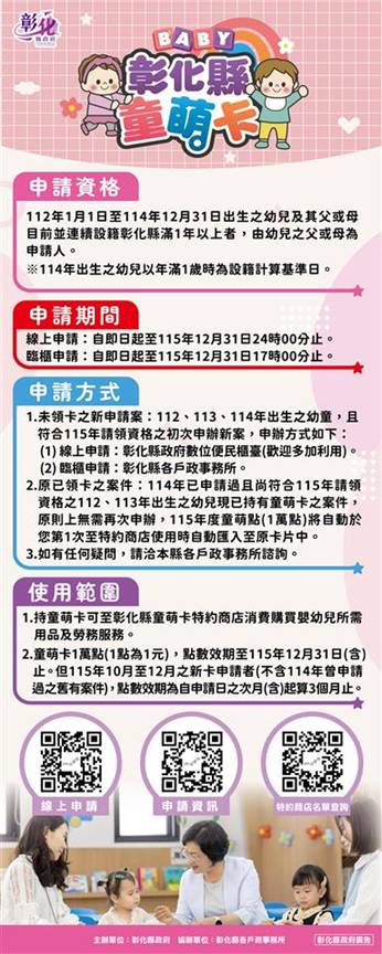 民政處表示,112年1月1日至114年12月31日出生幼兒,其父或母目前連續設籍彰化縣滿1年以上者,由幼兒之父或母為申請人,符合申辦資格者可領有1萬點(等值1萬元)的購物點數,預計逾2萬名彰化囡仔受惠。童萌卡點數除了可用於購買育兒用品與食品外,今年擴大新增幼童早期療育、幼兒休閒育樂與攝影等勞務服務項目,自115年4月1日起開放刷卡使用。