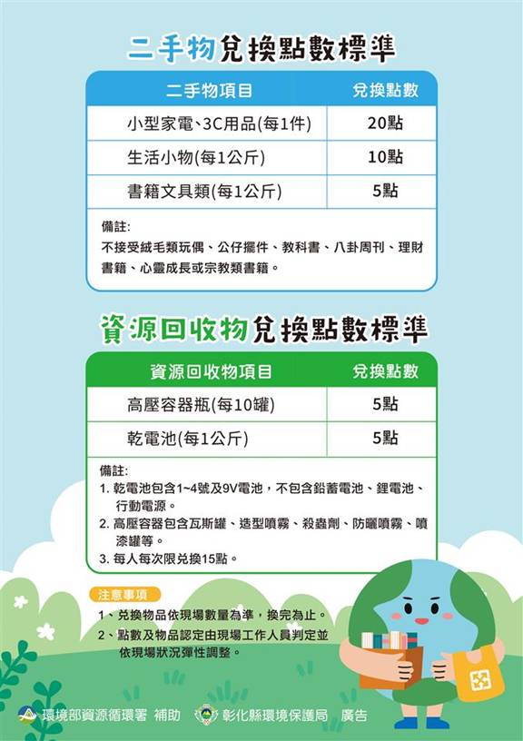 彰化縣環境保護局表示,本次活動現場將準備書籍文具、生活小物、小型家電等3類二手物品供民眾交換,並採「點數制」方式辦理。民眾可攜帶家中仍具使用價值之書籍文具、生活小物及小型家電至現場,經工作人員確認物品狀況後即可獲得對應點數,再依累積點數挑選喜愛的物品進行交換。不同類型物品將依性質給予相應點數,讓民眾能以物易物、共享資源。此外為鼓勵民眾落實資源回收,活動也開放攜帶指定資源回收物兌換點數,如廢乾電池、高壓容器及廢棄手機及平板,讓民眾可透過回收行動換取點數,進一步兌換所需物品,從源頭落實資源循環。